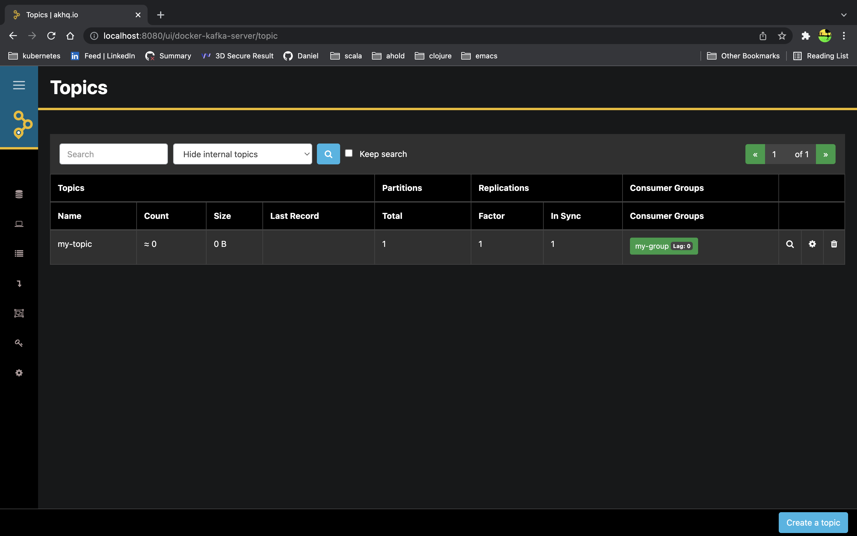 Let's verify if this is the case. In the docker-compose.yml we have defined that the AKHQ page is served at localhost:8080 which in turn connects to Kafka on port 9092.