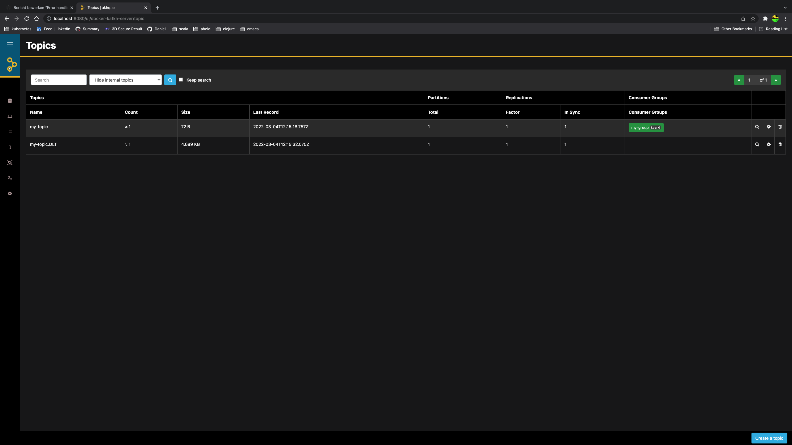 Reopen http://localhost:8080/ui/docker-kafka-server/topic again. After the retries have been exhausted Spring created the Dead letter topic because it didn't exist yet and posted the message to the dead letter topic.
