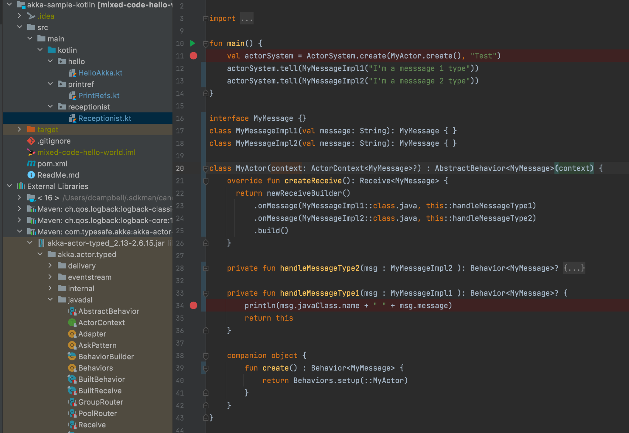 Akka offers a Scala and Java DSL. Sourcelabs has mainly Kotlin programmers and so we decided to program in Kotlin against the Java DSL which wasn’t too difficult, even for someone like me who is still very much working in Java on a daily basis.